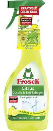 A Frosch zuhany és fürdőszobai tisztítószer a citromsav erejével hatékonyan távolítja el a vízkövet. Alkalmazható szappan maradványok, vízfoltok és egyéb szennyeződések esetén. Nem használható sav érzékeny felületeken pl. márványon, terrazzo dekor csempén és néhány zománcozott felületen. Környezetbarát, öko termék: Kőolajszármazék mentes Fenntartható és ene