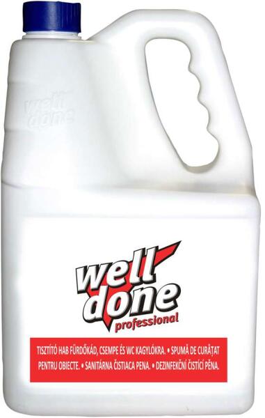 Well Done szanitertisztító hab nagy felületek gyors és könnyű tisztítására alkalmazható, mint például fürdőkád, csempe és WC kagylókra. Fehérít, fertőtlenít, eltávolítja a penészt és a vízkövet, fényt kölcsönöz, azonnal. A hab kiválóan megtapad bármilyen függőleges felületen is, így hatékonyabban tudja kifejteni hatását Szaniter tisztítóhab 5000 ml Well D