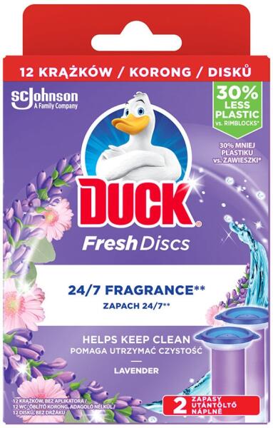 WC-öblítő korong utántöltő Duck Fresh Discs Lavender - Tökéletes tisztaság és frissesség a WC-hez. Ezzel a megbízható WC gélkoronggal a WC-je könnyen karbantarthatóvá válik. Minden öblítéssel megvédi a WC-csészét a vízkő ellen, és kellemes illatot hagy maga után, amely az egész helyiséget áthatja. Vigye fel a WC-csésze belső falára, a többit pedig hagyja, hogy a