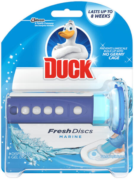 A WC öblítő korong zselés 36 ml Fresh Discs Duck® Marine egy WC-tisztító termék, amely zselés formában kerül forgalomba. A "Marine" jelző arra utal, hogy tengeri illatú, így friss és kellemes légkört teremt a WC környezetében. Ezeket a Duck® által gyártott korongokat általában a WC-kagylók tisztítására és illatosítására használják. A zselés forma lehetővé teszi