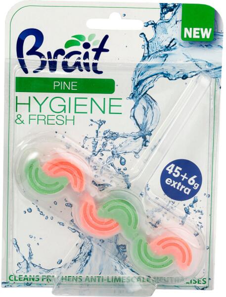 Brait Hygiene&fresh pine WC block 45g Hivatalos magyarországi forgalmazótól. Leírás: A Brait Hygiene & Fresh kétfázisú WC deók három különböző illatanyagot tartalmaznak, amelyek egyedi kialakítású hullámos kosárba vannak zárva, hogy az elhaladó vízsugár maximális hatékonysággal tudja eltávolítani a szennyeződéseket, és higiénikusan tisztítani a WC-t. Haszn