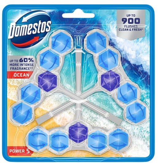 WC fertőtlenítő, 2 db-os, DOMESTOS "Power 5", óceán A Domestos Power5 WC frissítő blokkja segít megelőzni a koszt és a vízkőlerakódásokat a takarítások között is. Minden egyes öblítés után bőséges habot hagy maga után, amely segít megakadályozni a vízkőlerakódást, eltűntetni a koszt, és ragyogóvá tenni a WC kagylót, amely hosszan tartó kellemes illatot áraszt