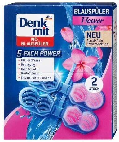 A kék vízszínezővel ellátott, kellemesen virágillatú Denkmit WC-tisztító és -illatosító rúd higiénikus tisztaságot és frissességet biztosít minden öblítéskor. Véd a vízkőlerakódás ellen és semlegesíti a kellemetlen szagokat. Kékre színezi az öblítővizet és virágos illatot áraszt magából minden öblítésnél. WC-tisztító és -illatosító rúd Kellemes virá