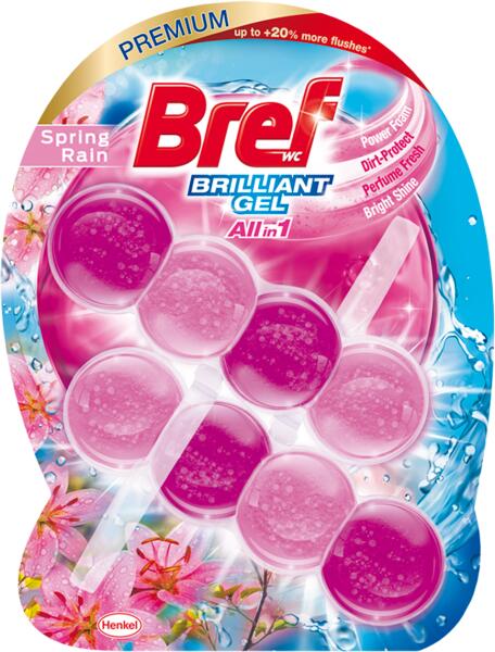 A Bref Brilliant Gel All-in-1 4 funkciós formulája nemcsak tisztítja a WC-t minden öblítéssel, de frissességet és briliáns ragyogást is kölcsönöz neki. A 4 funkció: 1. Fényes ragyogás 2. Tisztító hab 3. Szennyeződések elleni védelem 4. Extra frissesség és illat