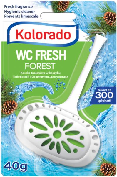 Kolorado "Fresh" fenyő illatú kosaras toalett block 40g Hivatalos magyarországi forgalmazótól. Leírás: A WC-frissítő megtisztítja a WC-csésze felületét és kellemes aromát kelt a WC-ben. Speciális tulajdonságainak köszönhetően megakadályozza a kőlerakódásokat.