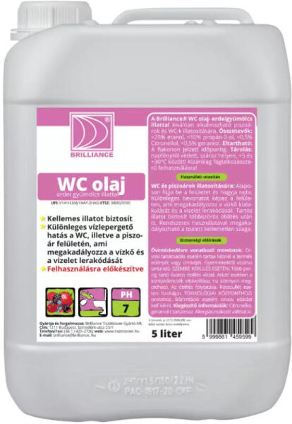 Kellemes illatot biztosít Különleges vízlepergető hatás a WC, illetve a piszoár felületén, ami megakadályozza a vízkő és a vizelet lerakódását Felhasználásra előkészítve A Brilliance® WC olaj erdei gyümölcs illattal kiválóan alkalmazható piszoárok és WC-k illatosítására. Használati utasítás WC és piszoárok illatosítására: Alaposan fújja be a felületet és