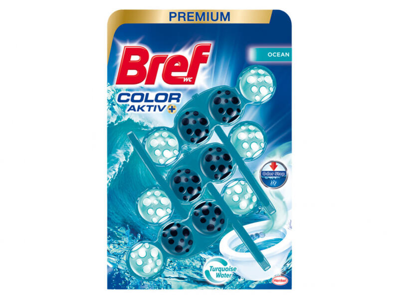 >Bref PRÉMIUM WC frissítő 3X50g - Oceán (Color Aktiv) A vécékagylóba akasztható Bref Color Aktiv WC-frissítő higiénikus tisztaságot nyújt az öblítések között Minden öblítéskor türkizkék színű tisztító folyadékot bocsájt ki, mely tisztíja a wc-jét Hatékony a vízszint alatt is, valamint frissességet biztosít az öblítések között is. Diszkrét kialakításáv
