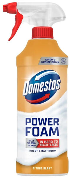 WC ÉS FÜRDŐSZOBA TISZTÍTÓ HAB 435 ML DOMESTOS POWER FOAM CITRUS BLAST A Domestos WC és fürdőszoba tisztító hab 435 ml egy erős tisztítószer, amelyet kifejezetten a WC-k és fürdőszobák higiéniai tisztítására fejlesztettek ki. Ez a termék hatékonyan távolítja el a szennyeződéseket, a vízkövet, és fertőtleníti a felületeket, így biztosítva a makulátlan tisztaságot