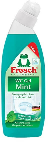 Toalett tisztító gél FROSCH menta 750ml Hatékonyan távolítja el a szennyeződéseket, vízkő- és vizelet lerakódásokat az egész WC felületén, még a perem alatt is, miközben megszünteti a kellemetlen szagokat.