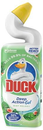 A menta illatú Duck Deep Action fertőtlenítő WC-tisztító gél megöli a baktériumok 99,9 %-át. Különleges, ívelt nyaknak köszönhetően a perem alatti rész is könnyedén elérhető, tisztaságot és friss illatot biztosít a toalettben. -WC tisztító folyadék menta illattal -megöli a baktériumok 99,9%-át -higiénikus tisztaság és friss illat -űrtartalom: 750 ml -menta illatta