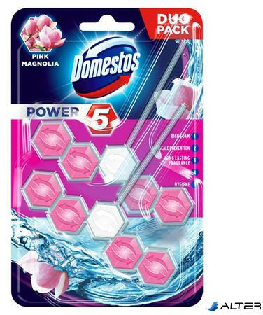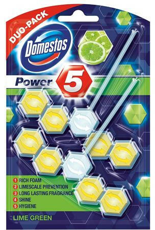 WC fertőtlenítő, 2 db-os, DOMESTOS "Power 5", lime A Domestos Power5 WC frissítő blokkja segít megelőzni a koszt és a vízkőlerakódásokat a takarítások között is. Minden egyes öblítés után bőséges habot hagy maga után, amely segít megakadályozni a vízkőlerakódást, eltűntetni a koszt, és ragyogóvá tenni a WC kagylót, amely hosszan tartó kellemes illatot áraszt mag