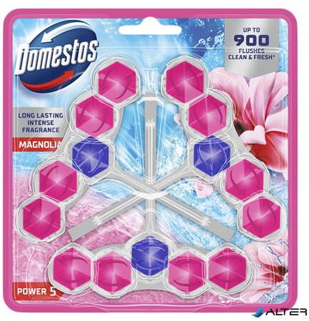 A Domestos Power5 WC frissítő blokkja segít megelőzni a koszt és a vízkőlerakódásokat a takarítások között is. Minden egyes öblítés után bőséges habot hagy maga után, amely segít megakadályozni a vízkőlerakódást, eltüntetni a koszt, és ragyogóvá tenni a WC kagylót, amely hosszan tartó kellemes illatot áraszt magából. - hosszantartó magnólia illat - tiszta és c