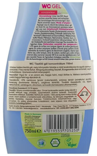 Erőteljes hatású szer, mely tisztán tartja a WC-kagylót. Könnyedén feloldja a mészkő lerakódásokat, a húgykövet és az egyéb szennyeződéseket. Használati utasítás: Nyomjunk a tubusból közvetlenül a vécékagyló pereme alá, rövid ideig hagyjuk hatni, majd öblítsük le. Makacs szennyeződések esetén hagyjuk hatni egész éjszakán keresztül. Összetevők