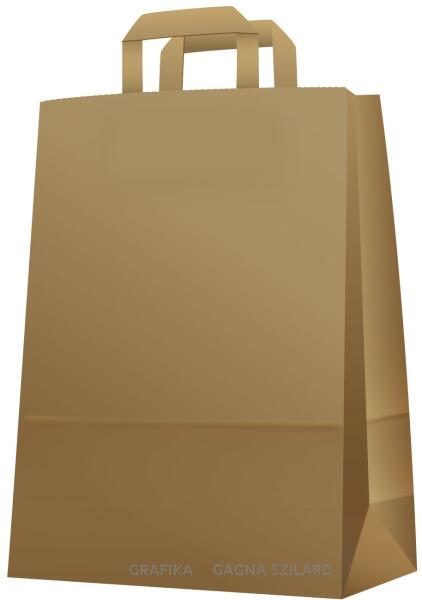 Barna papírból készült bevásárló táska/reklámszatyor szalagfüllel. A legkisebb választható mennyiség: 50 db, 250 db-os kiszerelés esetén kedvezőbb az ára.