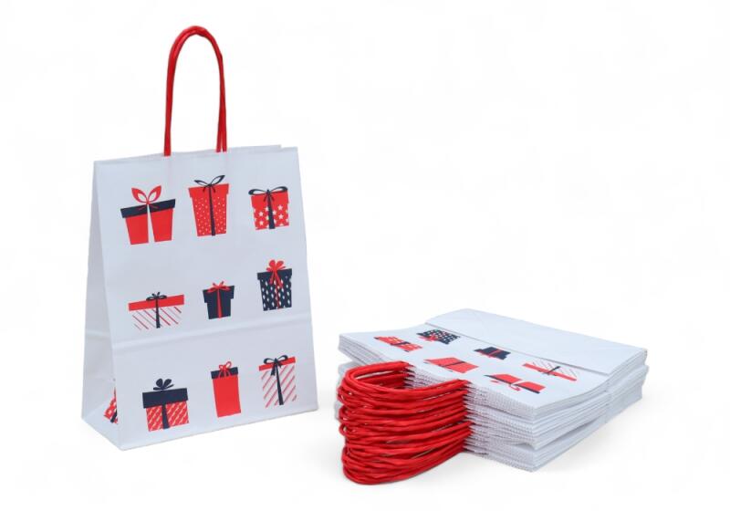 Karácsonyi sodrottfüles papírtáska fehér alapon ünnepi mintákkal, erős, piros fogófüllel. Olyan termékek szállítására alkalmas melyek nem nedvesek és nem túl nehezek. Minimum rendelhető mennyiség: 1db Kiszeretlés: 300db/doboz A feltüntett ár már a kiterjesztett gyártói felelősségi díjat.