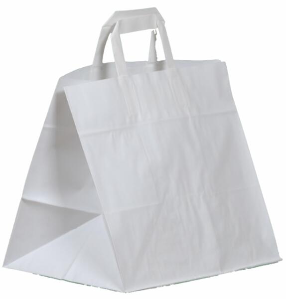 A széles talpú, 32x27+21 cm-es fehér színű elviteles papírtáska kiváló választás lehet abban az esetben ha cukrászdánkban, büfénkben vagy éttermünkben le szeretnénk cserélni ha környezetszennyező műanyag zacskókat. Jól pakolható, akár 3 kg-os terhelhetőséget is elbír, gazdaságos, és rendkívül praktikus. A 32x27+21 cm-es fehér színű széles talpú elviteles papí