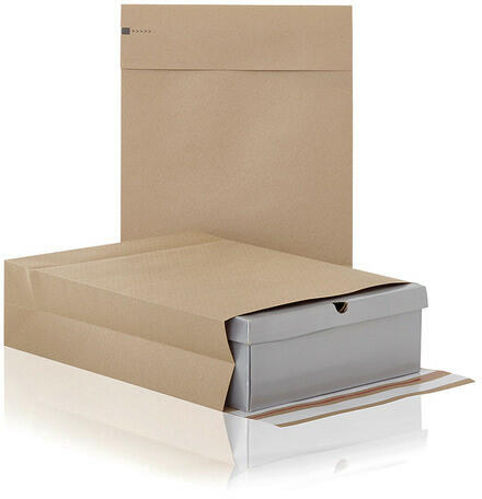 100%-ban újrahasznosítható Papyrus Ecommerce talpas papírtasak , két öntapadó szilikon csík kal. Erős kraft anyag ból készültek, így kiváló megoldást kínálnak például termékek el- illetve vissza küldésére . Ideális olyan termékekhez, amelyek nem igényelnek szilárd csomagolást vagy már előre csomagolt termékek. Formátuma: L. Méretei: 400 x 500 x 100 + 100 mm . Anya