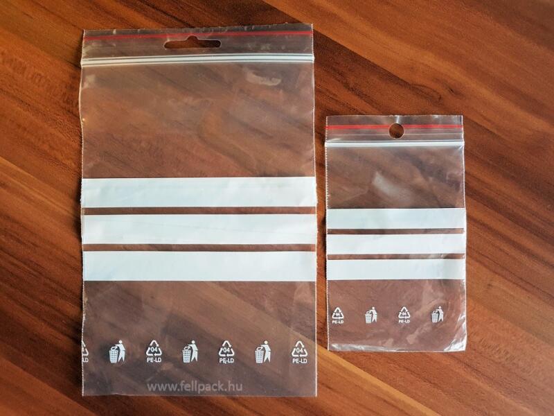 Önzáró simítózáras tasak akasztólyukkal, írható felülettel. Golyóstollal, alkoholos filctollal írható felülettel ellátva. Méret: 120 x 180 x 0,04 mm (szélesség x hosszúság x vastagság) A legkisebb választható mennyiség: 100 db, 1000 db-os kiszerelés esetén kedvezőbb az ára.