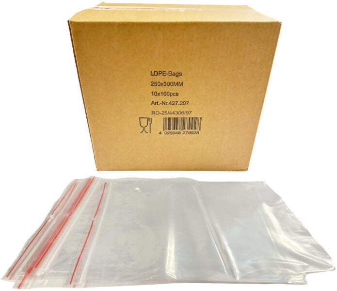 Polietilén (LDPE) tasak. A legkisebb választható mennyiség: 100 db, 1000 db-os kiszerelés esetén kedvezőbb az ára.