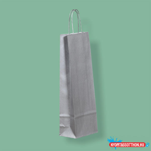 A kép illusztráció. Sodrottfüles, nyomatlan, nátronpapírból készült ezüst színű italtáska. Alapanyag: 110 g/m2 nátronpapír Magasság: 39 cm Szélesség: 14 cm Mélység (talp szélesség): 8 cm