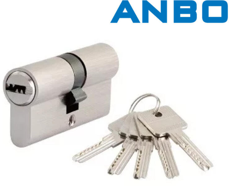 HENGERZÁRBETÉT 35/40 5K. FÚRTK. M. NIKK ANBO 2300 6db biztonsági csappal 5db nikkelezett kulcs Felfúrás elleni védelem (edzett acél vagy inox fúrásgátló csapok a henger mindkét oldalán) Szálcsiszolt matt nikkel kivitel Sárgaréz ház és hengercsapok, inox rugók a hosszú élettartam érdekében Szinterezett acélból készült tolókavivő, ami 30°-ban megáll a henger oldalán,