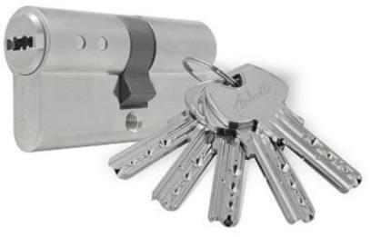 HENGERZÁRBETÉT 45/60MM 3K. KRÓM ANBO 2200 5db biztonsági csappal 3db nikkelezett kulcs Szálcsiszolt matt nikkel kivitel Sárgaréz ház és hengercsapok, inox rugók a hosszú élettartam érdekében Szinterezett acélból készült tolókavivő, ami 30°-ban megáll a henger oldalán, ezért amikor a kulcsot már kihúzták, megakadályozza hogy a hengert erővel kiüssék a zárból Europro