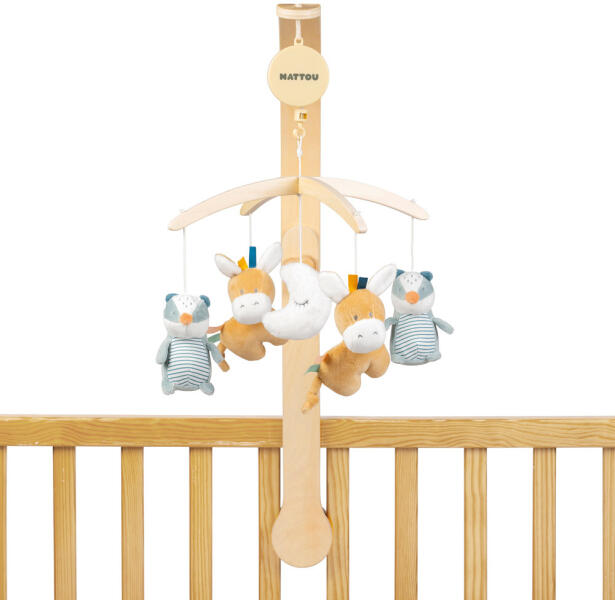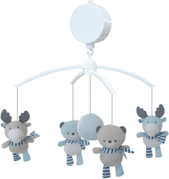 Zenélő körforgó Az imádnivaló zenélő-forgó, aranyos bújós figuráival – amelyek finoman forognak és mozognak az altatódal ritmusára – nyugodt alvást és édes álmokat biztosít. A zenélő-forgó egyszerűen és biztonságosan rögzíthető a kiságyhoz, bölcsőhöz vagy a járókához, a figurák pedig könnyen eltávolíthatók és mosógépben moshatók. - fa állvánnyal k