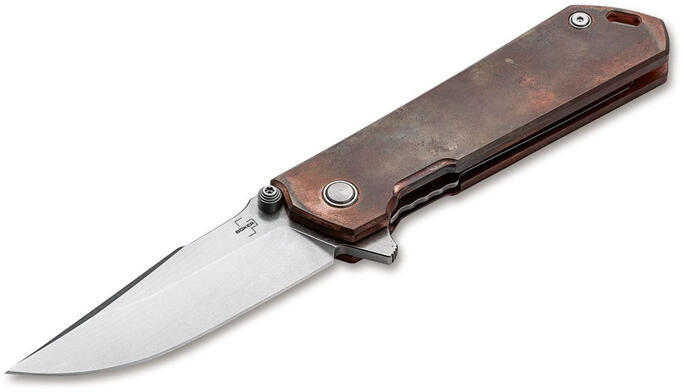 Böker Plus Kihon Assisted Copper EDC zsebkés A japán stílusú zsebkések amerikai mestere, Lucas Burnley ismét magasra tette a mércét. A Kihon egy agresszív és lendületes EDC bicska. Burnley stílusa természetesen azonnal észrevehető ezen a darabon is. A merész vonalvezetés és maximalizmusra való hajlam. A szigonyszerű penge D2 szerszámacélból készült kőmosott felülettel.
