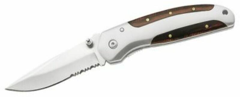 Félig fogazott pengéjű, osztott markolatú, egykezes bicska.