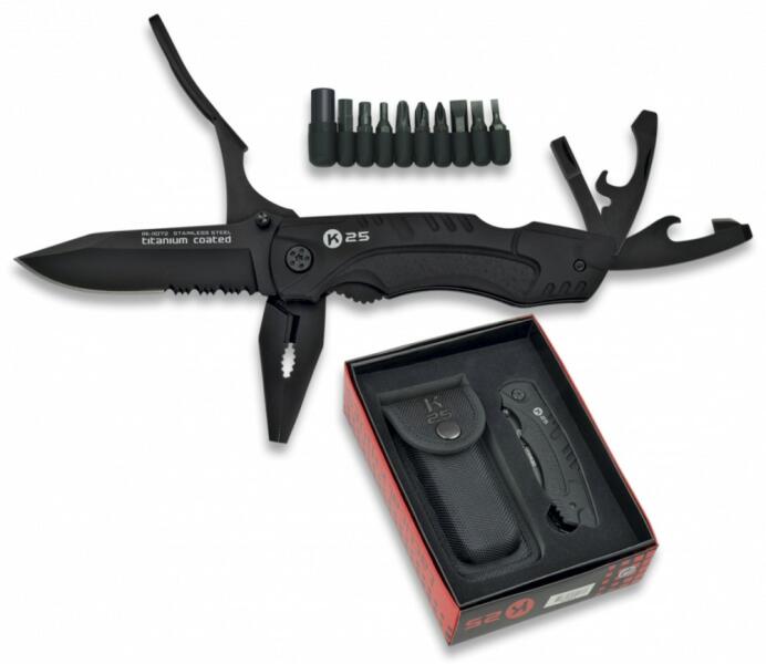 Túrázás és kempingezés során nagy hasznát vehetjük ennek a többfunkciós zsebkésnek. Legyen szó ételkészítésről, vagy akár a kerékpárunk szereléséről. Márka K25 Penge mérete 8 cm Fogantyú mérete 11,20 cm Teljes méret 19,20 cm Acél típusa 7Cr17Mov Penge típusa Normál Titán bevonatú Penge vastagsága2,80 mm 17 féle módon alkalmazható. Gyöngyvászon tokkal. Cseré