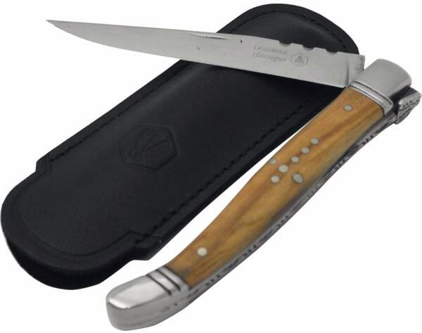 Zsebkés olajfa nyéllel. Fekete bőrtokkal együtt.