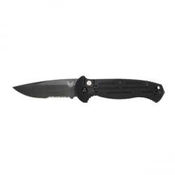 The Benchmade 9051SBK AFO II is a large automatic knife for uniformed services , featuring a partially serrated CPM 154 stainless steel blade, an enlarged deployment button and solid anodized aluminum liners. Tool steel The knife has a slim 90mm-long blade made of hard 154CM tool steel , hardened to a hardness of 58-61 HRC . 154CM is a high-carbon stainless steel enriched with molybdenum, so it ca