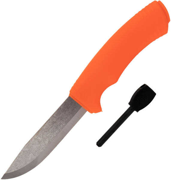 Robosztus svéd kés - -232 mm - narancssárga kivitelben, rozsdamentes acél pengével és tokkal, magnézium öngyújtóval és hegyezővel.