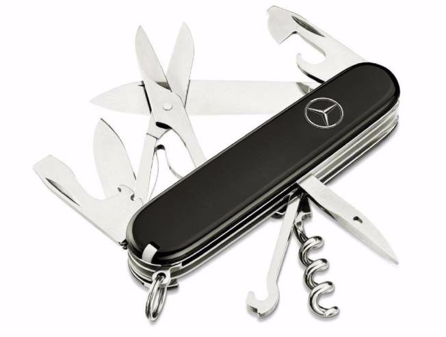 MERCEDES-BENZ VICTORINOX ZSEBKÉS, A GYÁR ÁLTAL FORGALMAZOTT TERMÉK A méltán világhíres svájci "Victorinox" cég készítette a Mercedes-Benz rendelése alapján ezt a Mercedes zsebkést. Tulajdonságai: - Fekete színű műanyag markolat - Rozsdamentes acél tartozékok - Kisméretű olló - Konzervnyitó - Palacknyitó, sörnyitó - 8.9 cm penge - Dugóhúzó - Kulcstartó - Csavarhúzó