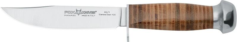 Penge acél: 420C rozsdamentes acél . Keménység: HRC 54-56. Markolat: bõr. Pengehossz: 11,5 cm. Teljes hossz: 22 cm. Pengevastagság: 3 mm. Súly: 105 gr. (FOX)