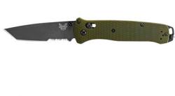 The Benchmade 537SGY-1 Bailout is a "black class" folding tactical knife equipped with a CPM-M4 steel tanto blade , an aluminum taper and anodized aluminum liners. The Benchmade Bailout is distinguished by its tactical styling, which is highlighted by the distinctive shape of the head and the military color scheme of the aluminum liners. The knife has a combo head with a Japanese tanto profile, ma