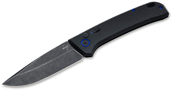Böker Plus FRND Black A Böker Plus FRND zsebkése durva taktikai kabátot kapott. A fekete kőmosás nemcsak brutális külsőt kölcsönöz a késnek, de nagyon praktikus a használatból eredő karcok ellen is. A penge D2 szerszámacélból készült fekete kőmosással. Az automata nyitást nyomógomb működteti. A markolat anyaga fekete Grivory durván textúrázva. Egyszerű, de mégis ké