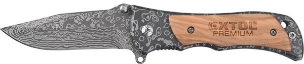 Rozsdamentes acél penge titánszürke színben, lézeres kontúrokkal damaszkuszi acél stílusban. Fogantyú világosbarna fával átlapolva. Biztosíték a kés spontán zárása ellen.