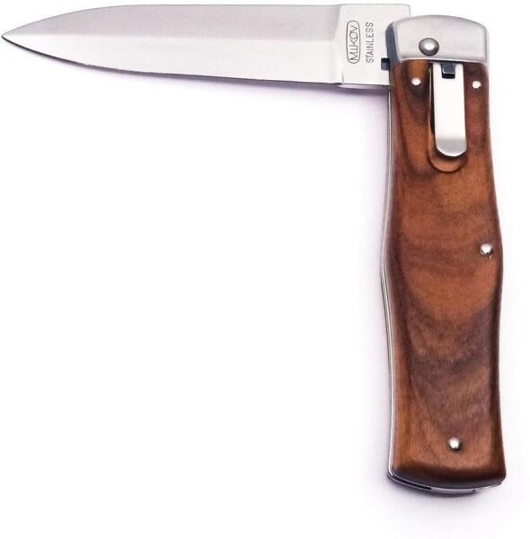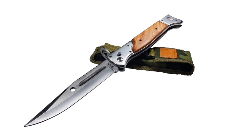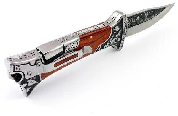 Foxter összecsukható kés, 23 cm, gravírozott fa, akasztókapocs, acél és fa Nagyon masszív és praktikus összecsukható vadászkés. A tartósságot és a jó megjelenést vastag penge biztosítja, amelyet számos kiváló minőségű rozsdamentes acél gravírozás díszít. A vastag, széles fogantyú fa elemekkel tökéletesen illeszkedik a kézbe, erős és kényelmes fogást biztosít