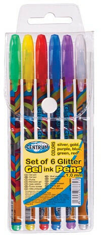 Zselés toll Centrum Glitteres 6 db-os klt. Zseléstoll készlet vidám mintás testtel és csillogó tintával 6 színben írás színek : zöld, citromsárga, piros, kék, lila, rózsaszín írás vastagság: 1,0 mm