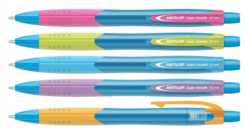 Antilop Super Smooth prémium minõségű nyomógombos, csúszásmentes gumírozott testű golyóstoll, vegyes neon színű külsõ. A betét kék színű olajzselés tintát tartalmaz, mely könnyű gördülékeny írást tesz lehetõvé. Írásvastagság: 0,7 mm Kiszerelés: 12 db/doboz.