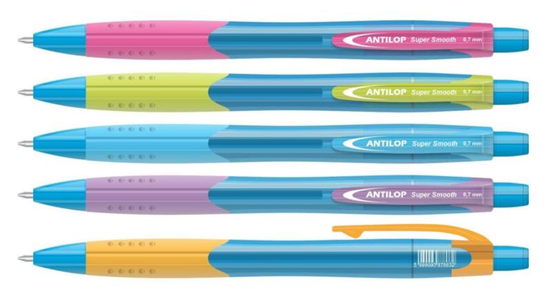 Antilop Super Smooth prémium minőségű nyomógombos, csúszásmentes gumírozott testű golyóstoll, vegyes neon színű külső. A betét kék színű olajzselés tintát tartalmaz, mely könnyű gördülékeny írást tesz lehetővé. Írásvastagság: 0,7 mmKiszerelés: 12 db/doboz. Katalóguskód: 46146 Szavatosság: a jogszabályi előírások szerint.