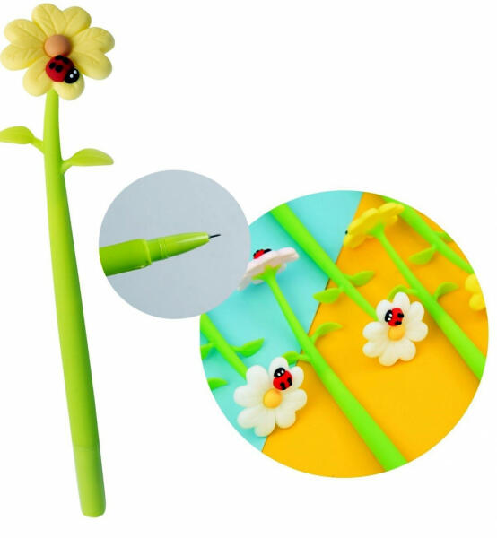 Zselés toll virág formájú katicával - sárga Zselés toll virág formájú katicával - sárga. Lepd meg kislányod, vagy akár saját magad, egy aranyos, margaréta virág formájú tollal , melynek citromsárga színű virágszirma van, rajta pedig egy kis katicabogár látható. A toll teste zöld színű, akárcsak a valódi virágok szára, a virág feje pedig írás közben mozog , ahog