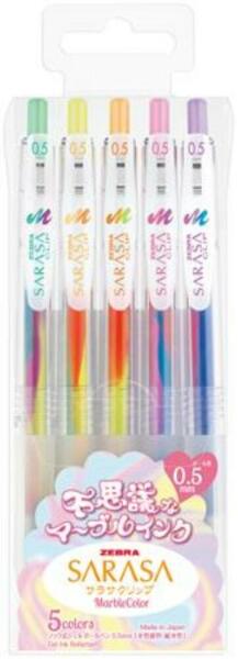 Zseléstoll készlet, 0,33 mm, nyomógombos, ZEBRA Sarasa Clip Marble, 5 vegyes szín (TZ16920) Meglepetés és vidámság egy tollban - 3 divatos szín egy zseléstollban -lágy, nem maszatolódó, tartós, vízálló tinta -erős, csipeszes klip -környezetbarát (75%-ban újrahasznosított) -sötét papíron szépen mutat -a készlet színei: trópusi mangó, vattacukor, áfonya smoothie, hawai