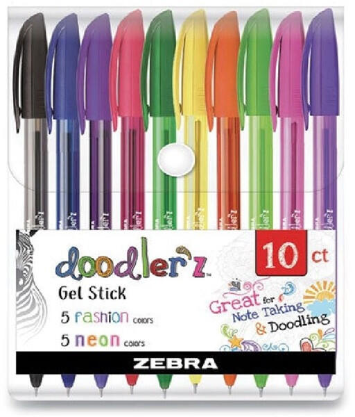 Zebra Doodlerz Fashion&Neon 10db-os zseléstoll készlet Izgalmas csillogó vagy neon színekben elérhető tollunk a kreatív alkotók nagy kedvence. Sokoldalú zselés toll, ugyanis nemcsak a szokványos fehér papíron, de sötét papíron is kiválóan mutat. Háromszögletű testének és lágy, vízálló tintájának köszönhetően könnyű vele írni, egyenletes írásképet nyújt. 1