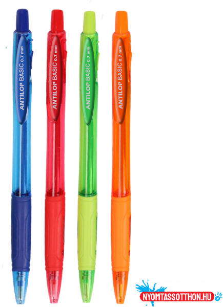 Zselés toll nyomógombos vegyes színek 0,7mm Antilop Basic írásszín kék Antilop Basic oldalt kapcsos nyomógombos, csúszásmentes gumírozott testű golyóstoll, vegyes neon színű külső testtel. A betét kék színű olajzselés tintát tartalmaz, mely könnyű gördülékeny írást tesz lehetővé. Írásvastagság: 0,7 mm A kép illusztráció. Az ár egy darabra érvényes.