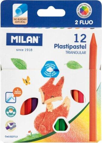 Milan: Háromszög alakú zsírkréta készlet. A csomagban összesen 12 különböző színű zsírkréta található. A zsírkréták hegyezhetők, nem maszatolnak. Csomagolás mérete: 15,3 x 10,7 x 1 cm