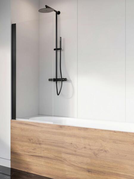 Kifelé â befelé nyitható fekete kádparaván. |Méret: 100 cm|Magasság: 150 cm|Profil színe: fekete|Üveg: átlátszó|Jobbos kivitel|6 mm vastag, Easy Clean vízlepergető bevonattal ellátott edzett üveggel gyártjuk, mely elsőrendű megoldás a vízkőfoltok ellen, valamint a lerakódások megakadályozására. |Precíz vízzárást biztosító emelőmechanikás profilzsanér az u¨
