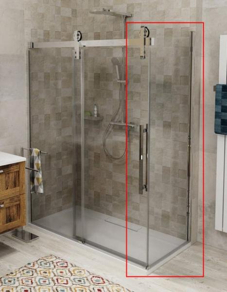 Fali profillal a falra szerelhető pengefal 8 mm-es Easy Clean edzett üvegből, az egyik végén 30 cm-es befordulóval. |Méret: 120x90 cm|Magasság: 200 cm|Profil színe: króm|Üveg: átlátszó|8 mm vastag Easy Clean vízlepergető bevonattal ellátott edzett üveggel gyártjuk, mely elsőrendű megoldás vízkőfoltok, lerakódások megakadályozására. |Nagy stabilitást biztosító krómo
