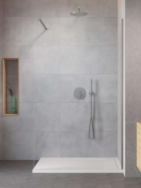Panoráma a fürdőszobára. Zuhanykabin minimalista stílussal. Szinte észre sem veszi, és tágasabbá teszi a fürdőszobát. 8 mm vastag Easy Clean vízlepergető bevonattal ellátott edzett üvegből gyártjuk, mely elsőrendű megoldás vízkőfoltok, lerakódások megakadályozására. Az állítható takaróprofil lehetővé teszi a fal függőleges eltéréseinek kiigazítását. Zuhanyt